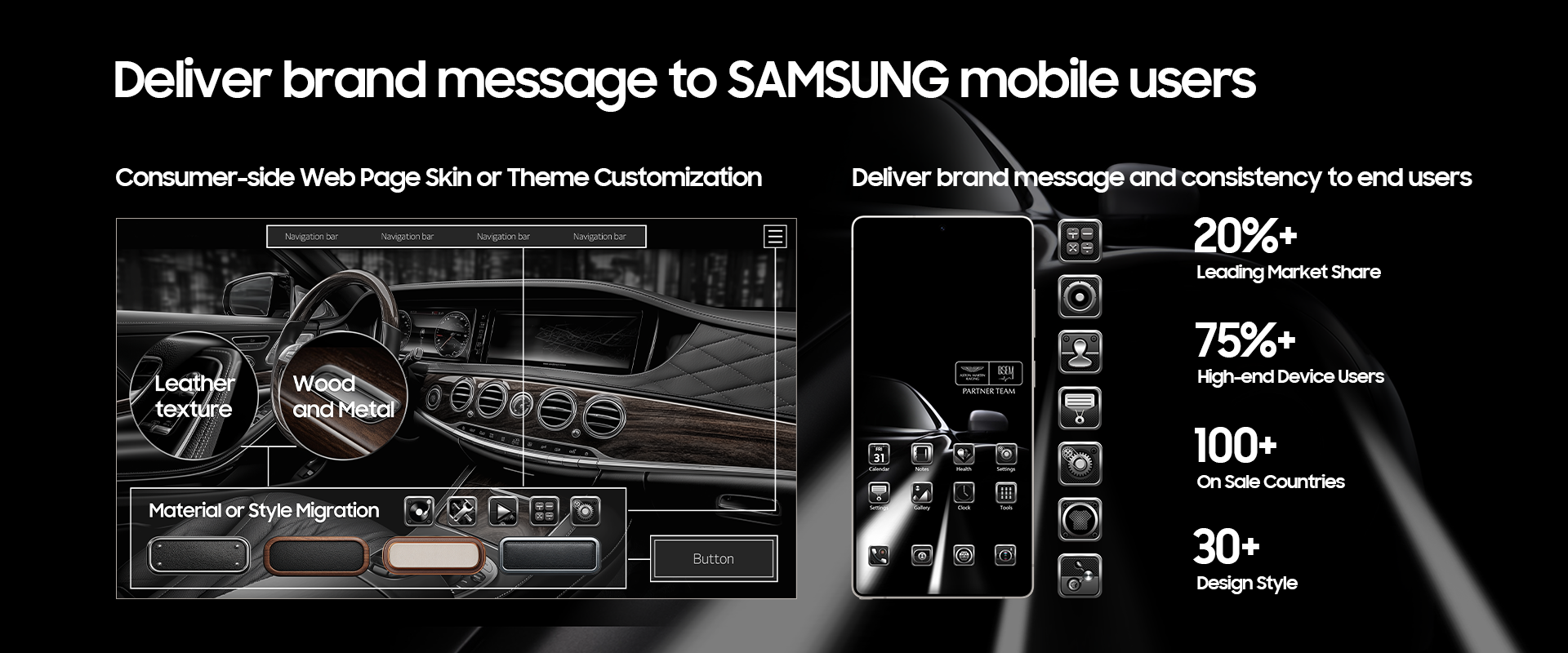 Collaboration and Business Expansion: Assist enterprises in designing exclusive Samsung Galaxy phone themes based on their brand identity, proprietary IP, and products. Customize themes or wallpapers for Vehicle Display. Customizable wallpapers and stickers can be created for multi-channel promotion across social media platforms. We also offer customization of official website skins or themes, as well as event page skins or themes, extending brand aesthetics and materials through technical means while maintaining consistent branding. Ultimately, we help enterprises reach global consumers.