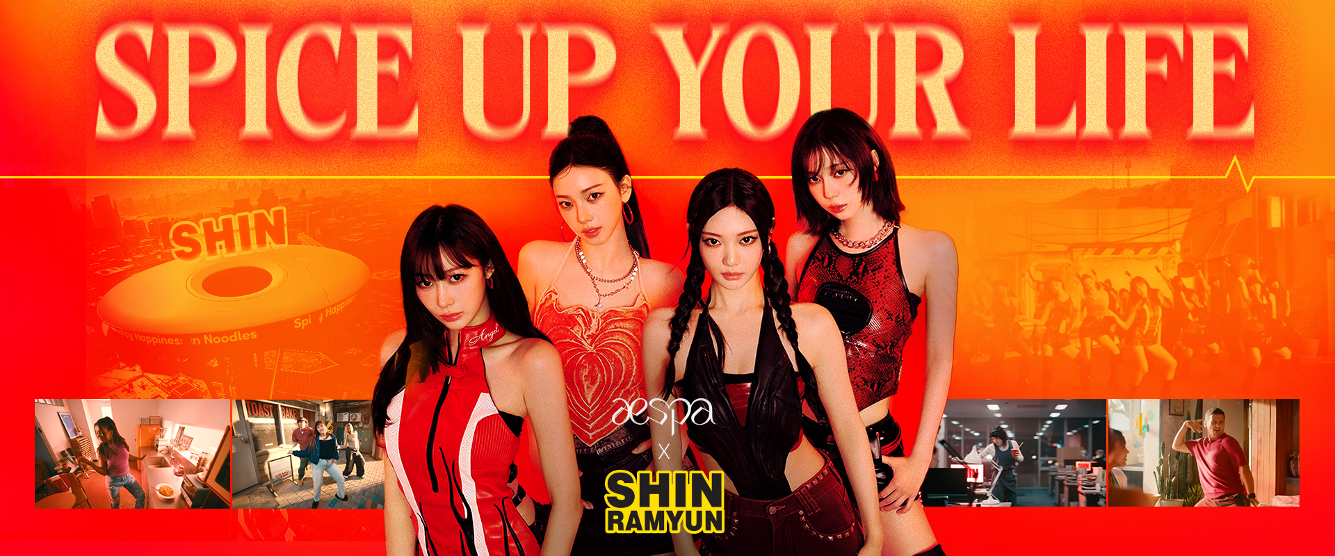 신라면이 가지고 있는 매콤한 행복을 전 세계인들에게 전달한다는 내용을 바탕으로, 라면 포장지를 열고 물을 붓고 젓가락을 준비하는 동작과 'SHIN'을 춤으로 표현한 신라면 댄스도 선보였으며, 영국의 유명 팝그룹 '스파이스 걸스'의 대표 인기곡 'Spice up Your Life'를 에스파가 특유의 매력을 살려 가창했습니다.  이러한 음악과 퍼포먼스 매개체를 통해 'Spicy Happiness In Noodles' 브랜드 메시지를 강렬하게 전달하고자 했고, 글로벌 소비자들의 공감대를 자연스럽게 형성시키는데 주력했습니다.